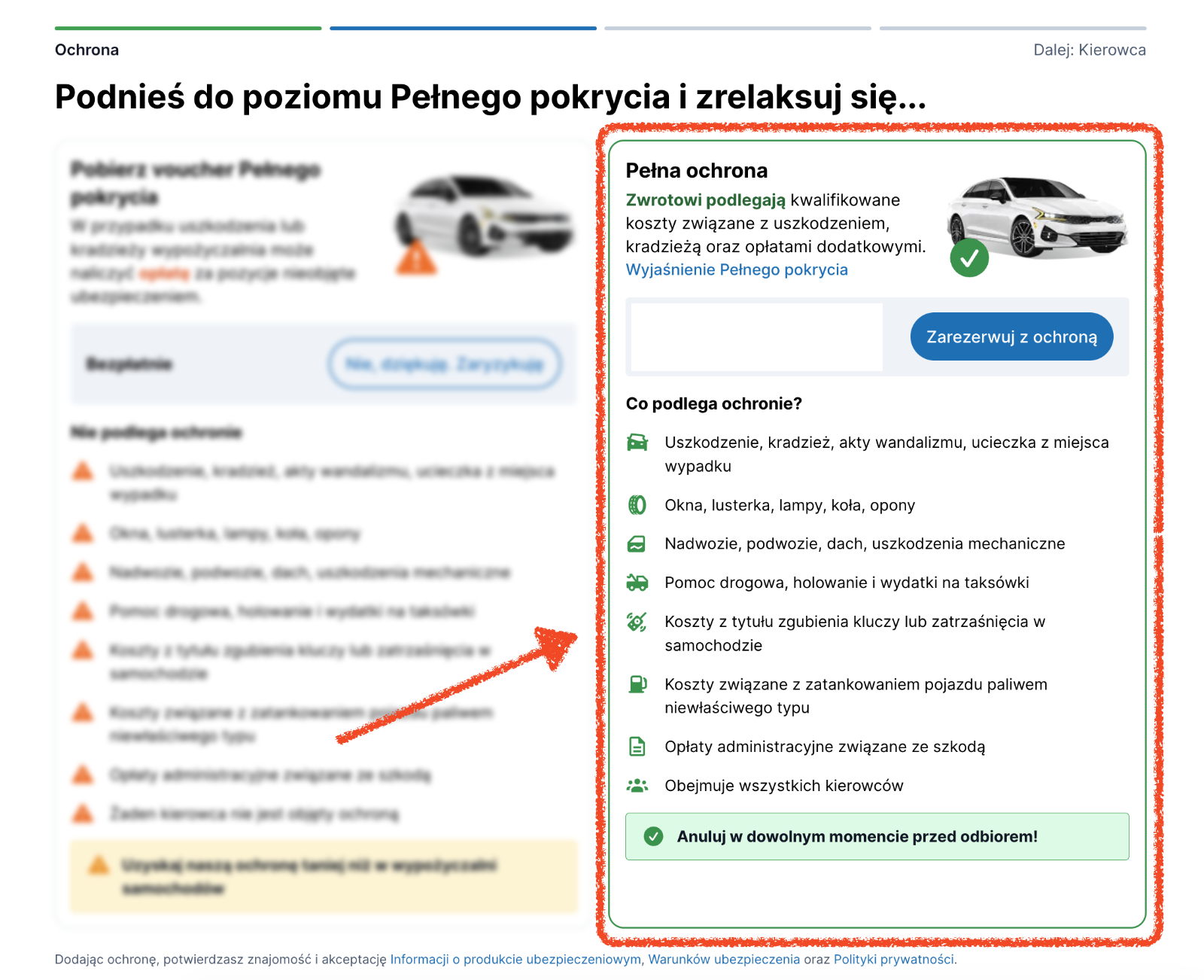 Po wyborze auta z listy, przejdziesz na stronę z podsumowaniem, a w jeszcze następnym kroku zobaczysz reklamę dodatkowego ubezpieczenia – nie od wypożyczalni, ale od pośrednika. Czy warto je wykupić?
