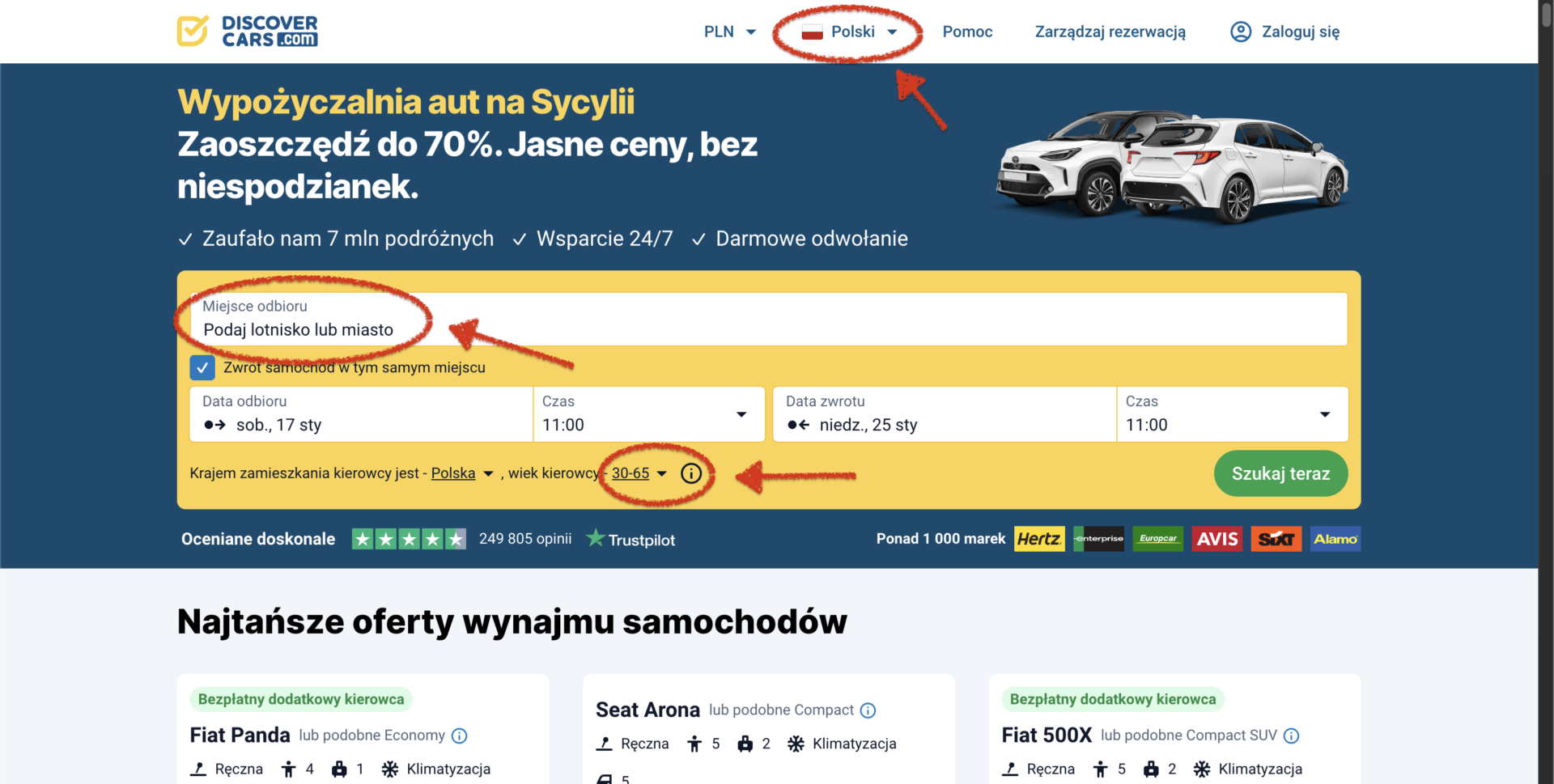 Aby sprawdzić aktualne oferty, wejdź na podlinkowaną powyżej stronę. Upewnij się, że masz ustawiony język polski strony. Wpisz miejsce odbioru, np. Palermo lub Katanię, a następnie daty wynajmu. Jeśli masz mniej niż 30 lat lub więcej niż 65, to odznacz okienko w miejscu, które zaznaczyliśmy na poniższej grafice. Niektóre wypożyczalnie nie dają samochodów na przykład bardzo młodym kierowcom lub pobierają za to dodatkową opłatę.