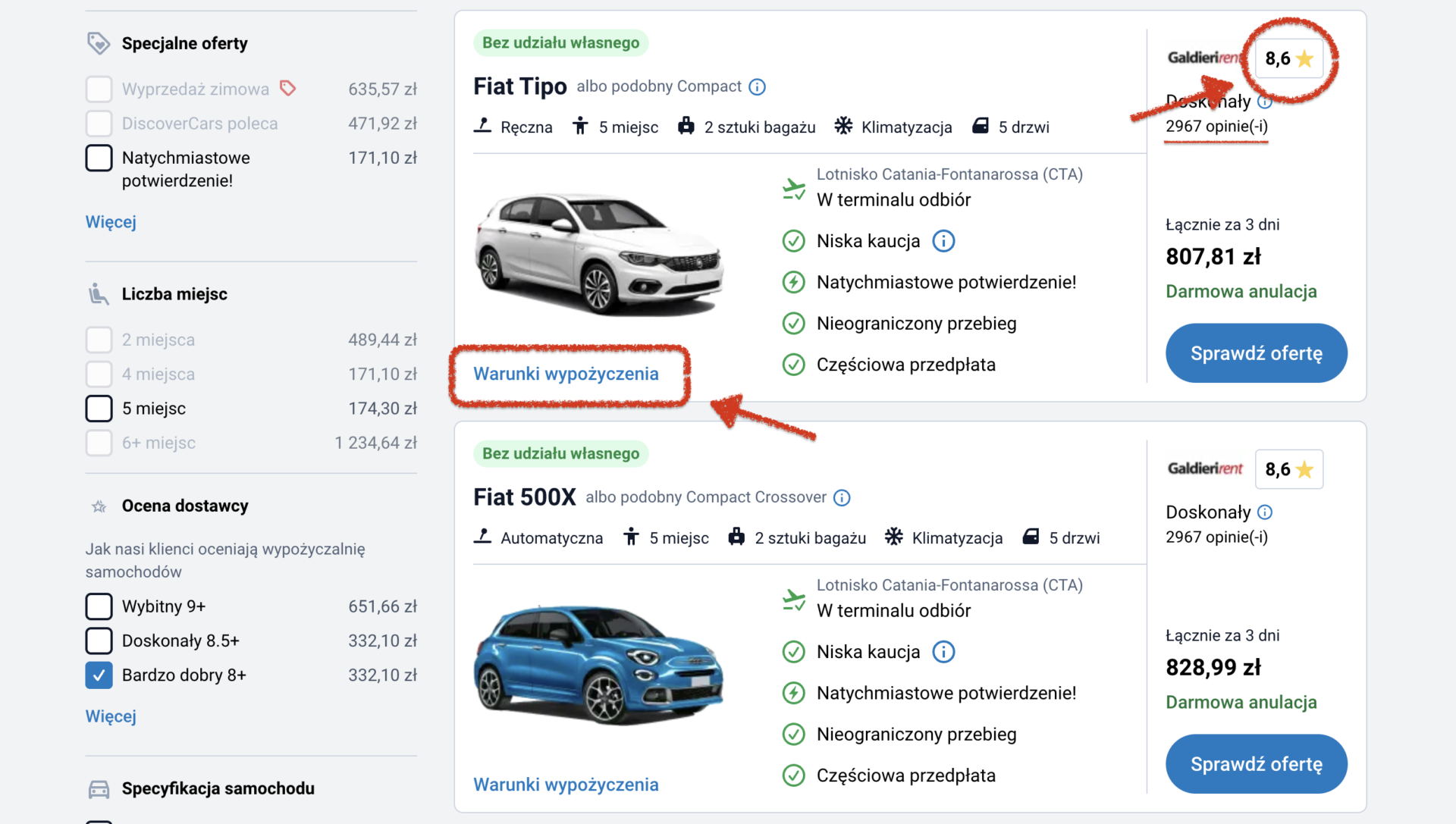 Po pojawieniu się wyników wyszukiwania, zobaczysz dziesiątki samochodów. W pierwszej kolejności, po lewej stronie użyj filtrów, aby od razu pozbyć się tych ofert, które nie spełniają twoich wymagań. Najważniejsze to „Ocena dostawcy” – my ustawiamy zawsze na „bardzo dobry 8+”, „Przebieg” – ustawiamy „nieograniczony” oraz „Kaucja zwrotna” – ustawiamy opcję bez depozytu, a jeśli ceny takiego wynajmu robią się wysokie, to najniższy z dostępnych. Jeśli nie masz karty kredytowej, to w filtrach również możesz to zaznaczyć.