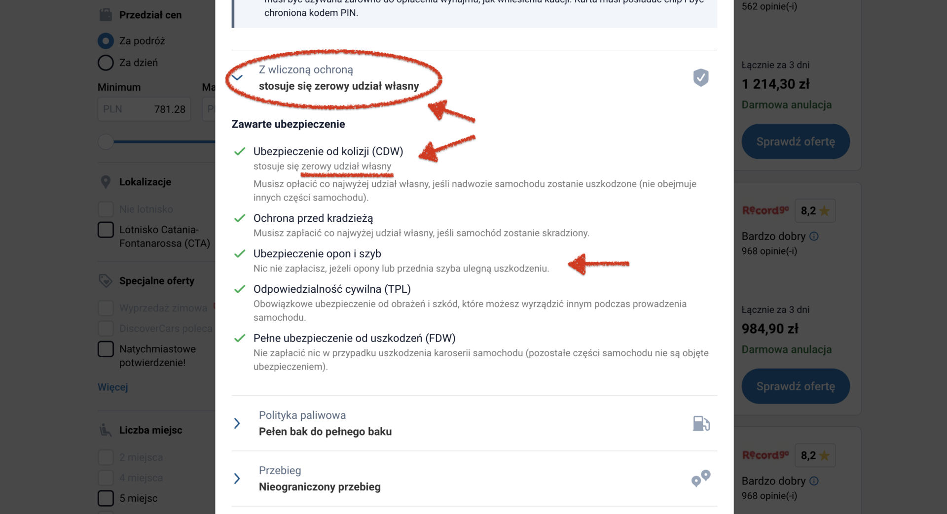Jaki widzisz, mamy tu wyraźnie zaznaczone, że ta oferta zawiera zerowy udział własny, co oznacza, że w przypadku kolizji czy kradzieży, nie ponosisz żadnych opłat. Wiele wypożyczalni zamiast tego, będzie mieć tu wpisane różne kwoty, więc łatwo porównasz, która cię zabezpiecza, a która w sytuacji awaryjnej pobierze z konta kilka tysięcy za naprawę szkód. Co ciekawe, tutaj mamy też miłą niespodziankę – w cenie jest ubezpieczenie opon i szyb, co jest rzadkością – większość firm wyłącza je z ubezpieczenia.